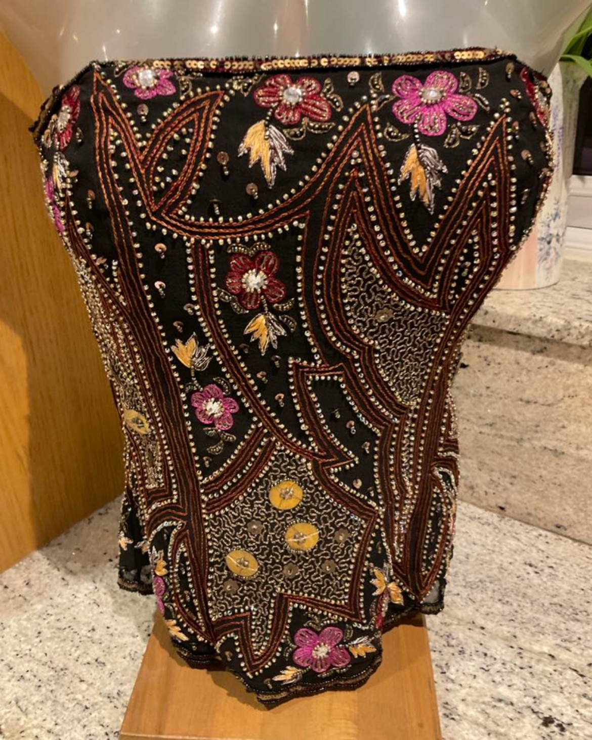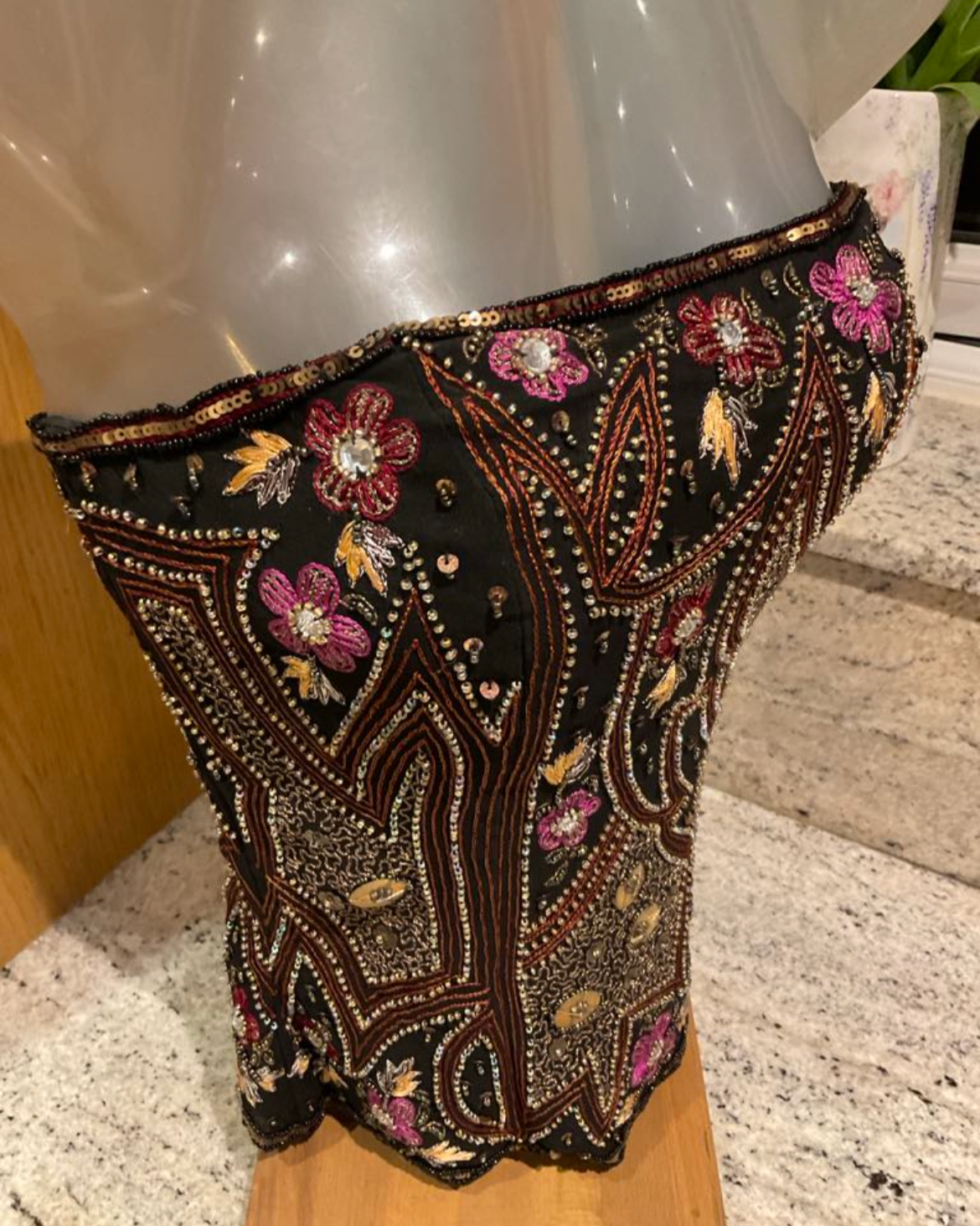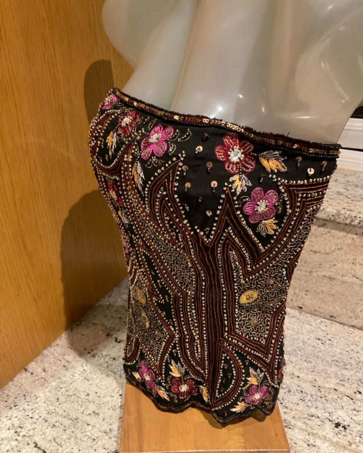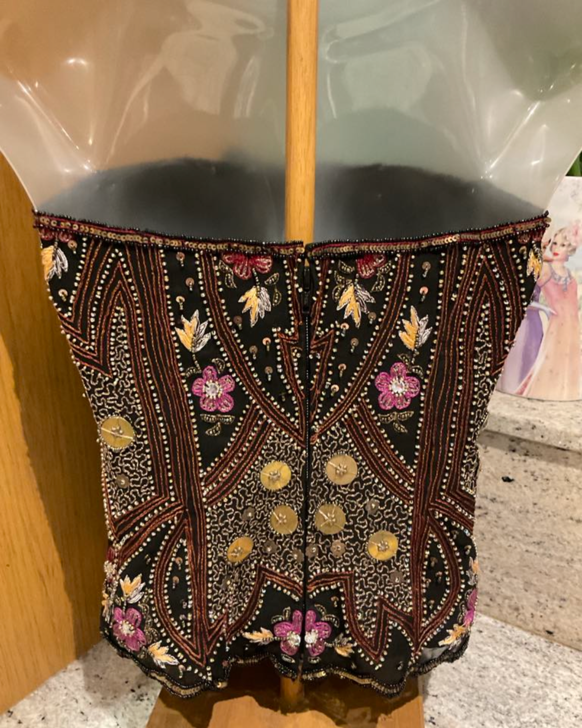 This vintage corset-style bustier top is the epitome of elegance and bold fashion. With intricate embellishments that add a touch of glamour, this strapless design highlights your natural shape and contours your figure beautifully. The structured corset construction offers support while creating a flattering silhouette, making it a statement piece for any occasion. The absence of straps enhances its sophisticated look, allowing you to pair it effortlessly with both casual and formal outfits. A true vintage treasure, this top combines timeless style with eye-catching details for a piece that's both unique and unforgettable.