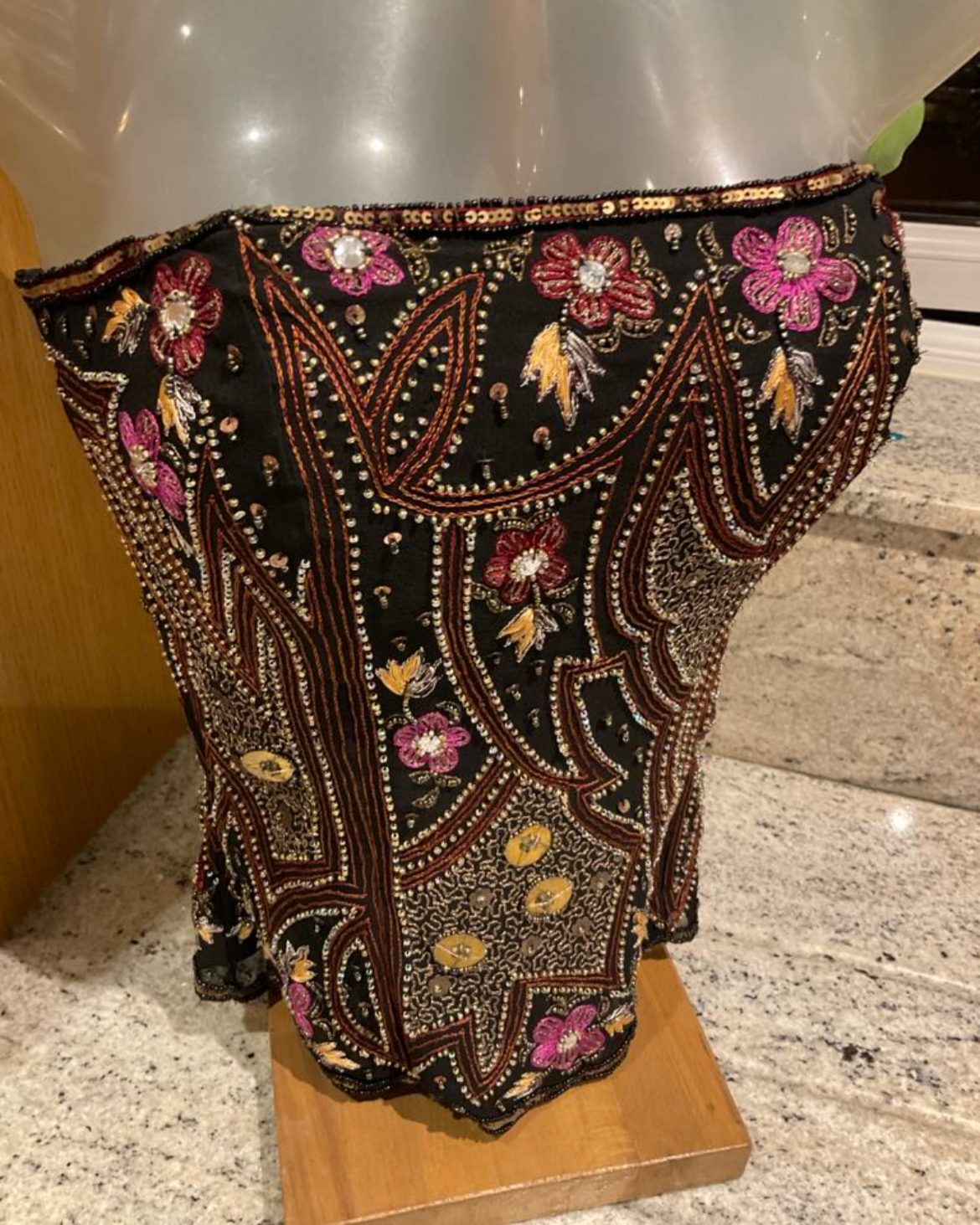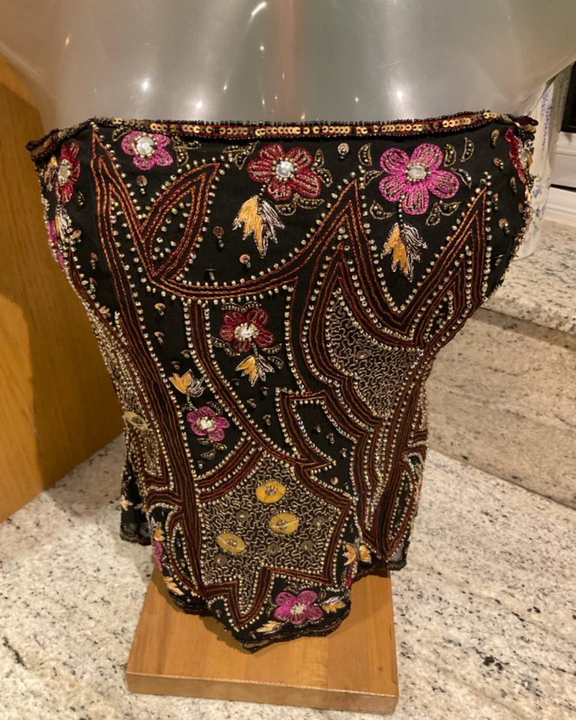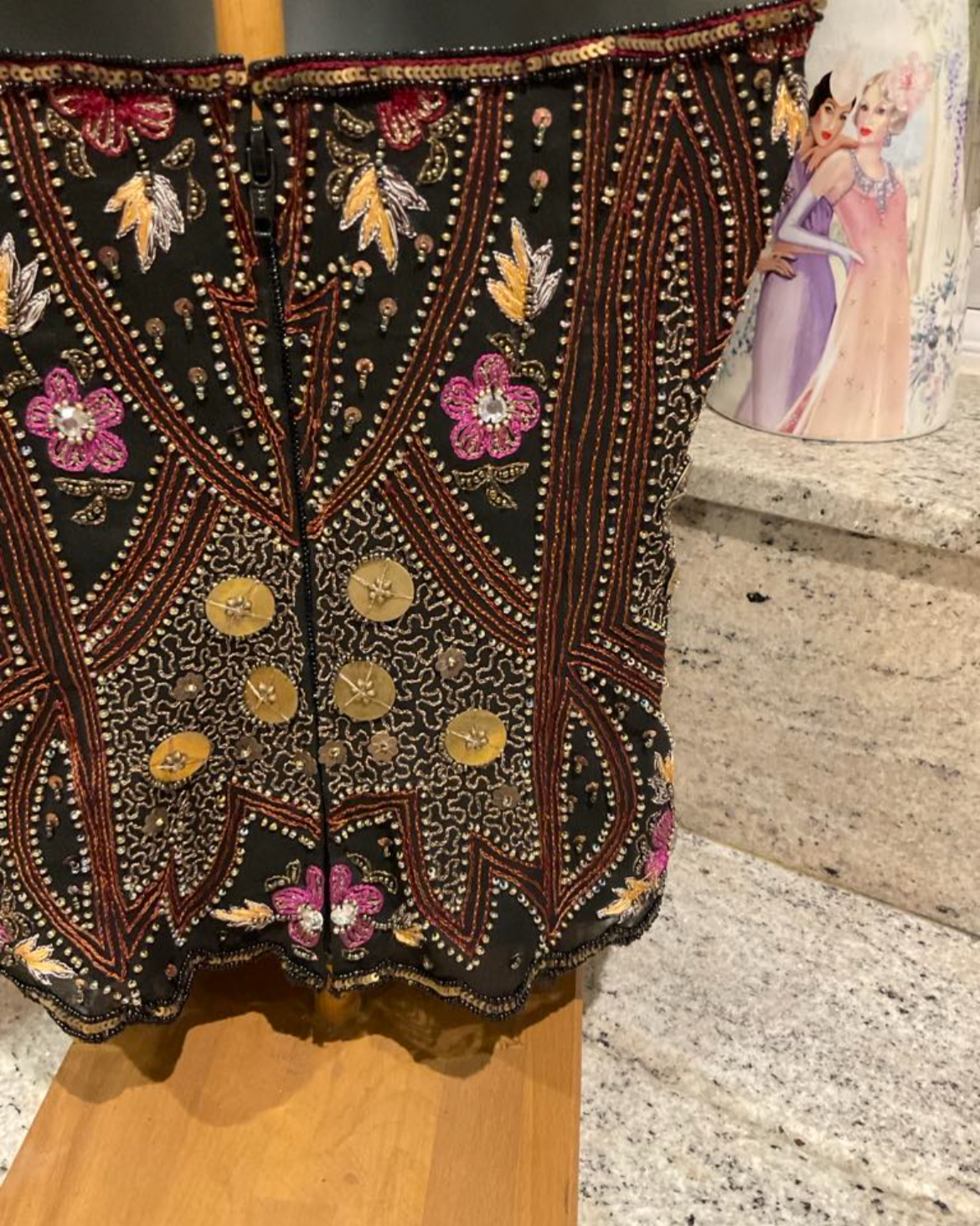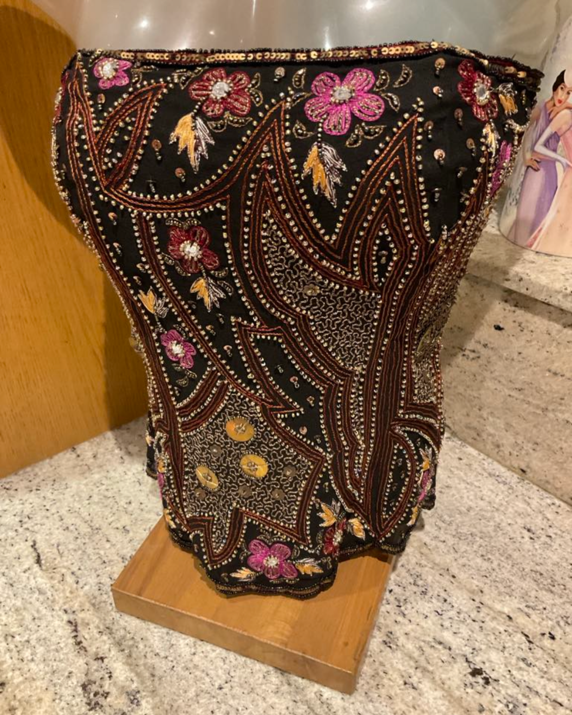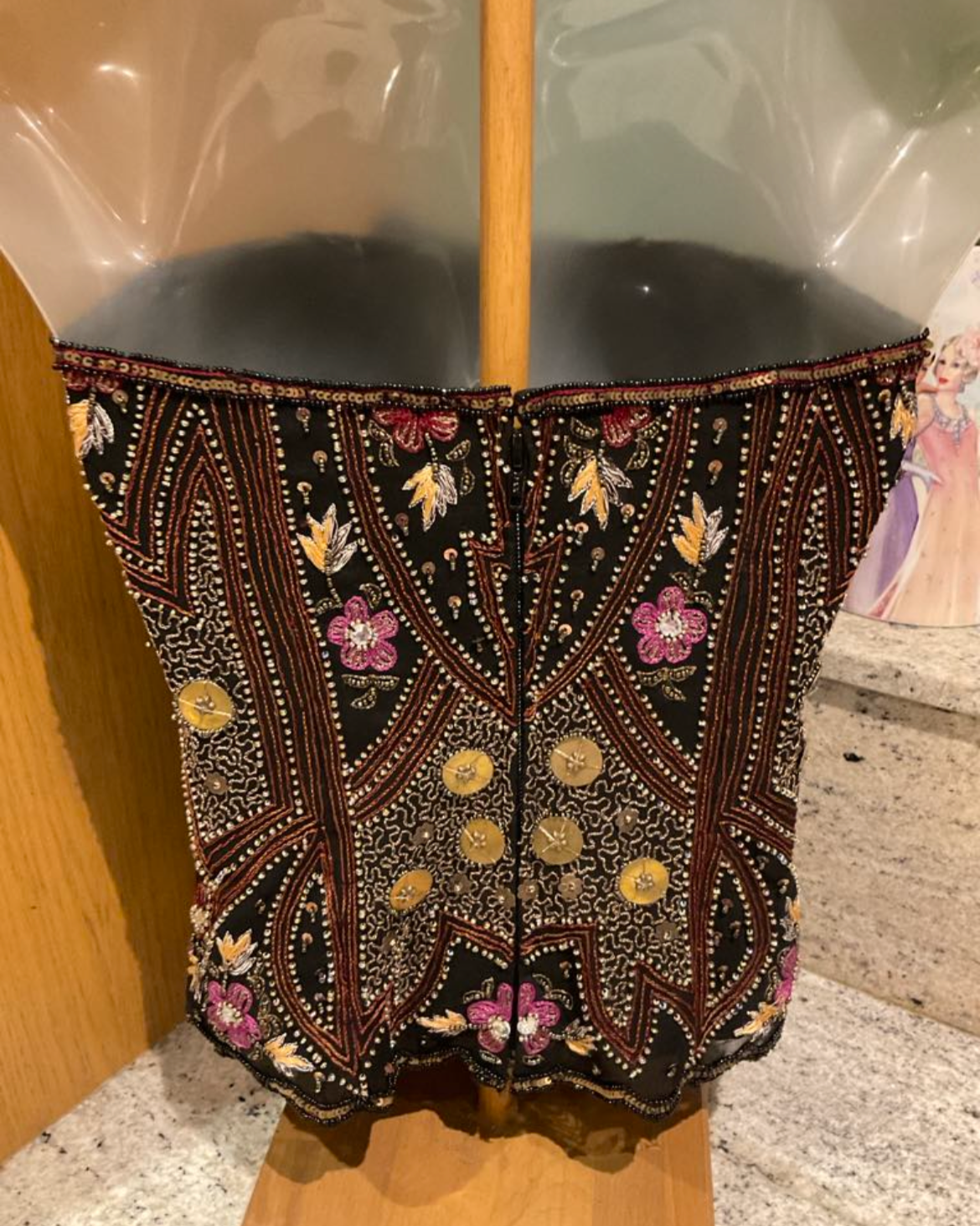 This vintage corset-style bustier top is the epitome of elegance and bold fashion. With intricate embellishments that add a touch of glamour, this strapless design highlights your natural shape and contours your figure beautifully. The structured corset construction offers support while creating a flattering silhouette, making it a statement piece for any occasion. The absence of straps enhances its sophisticated look, allowing you to pair it effortlessly with both casual and formal outfits. A true vintage treasure, this top combines timeless style with eye-catching details for a piece that's both unique and unforgettable.