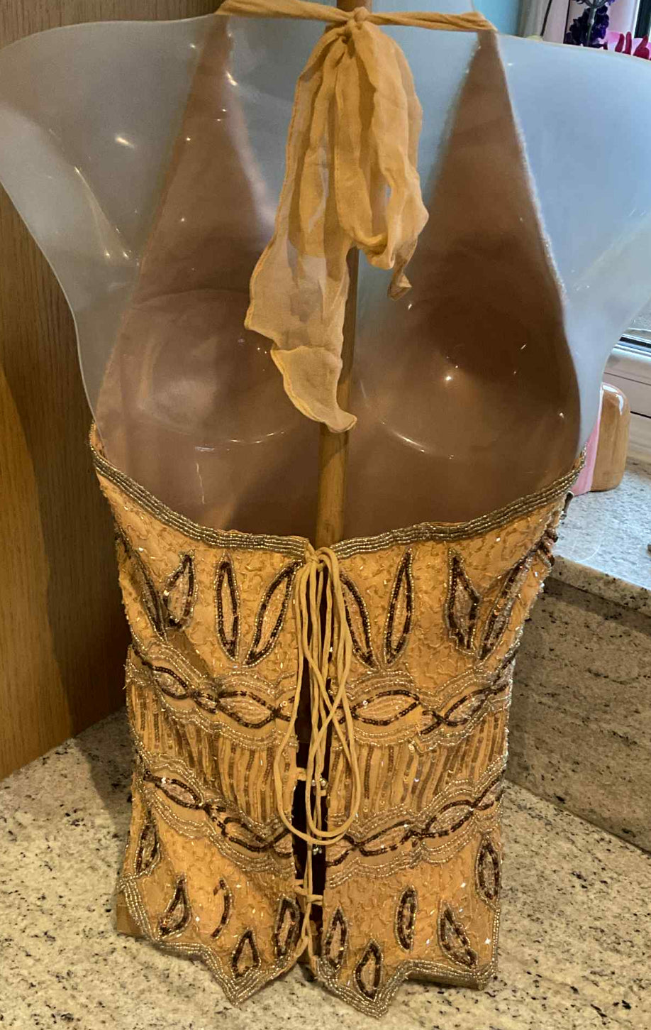 This vintage bustier top exudes timeless allure with its stunning lace-up back, allowing you to contour the fit to your body for a personalized, flattering shape. The intricate full embellishment adds an extra layer of elegance, making it a statement piece that catches the light with every movement. Designed to accentuate your curves, the bustier features delicate details that highlight its vintage charm while offering a modern twist. Perfect for pairing with high-waisted skirts, pants, or under a blazer, this top combines vintage sophistication with contemporary style, making it a versatile and captivating addition to your wardrobe.