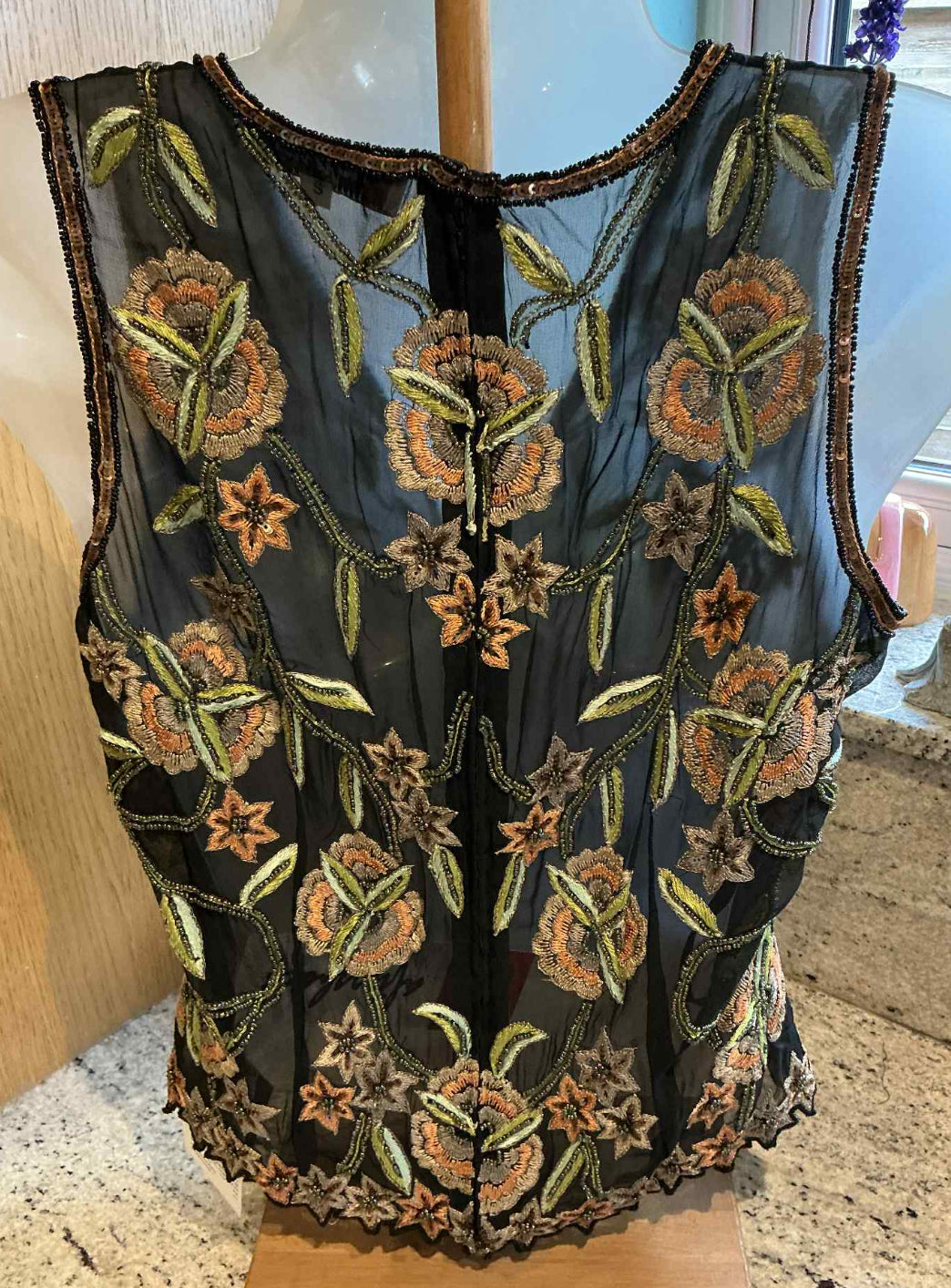 This vintage tea top is a true work of art, featuring intricate beadwork that adds a touch of elegance and sophistication to its unique design. Carefully crafted with attention to detail, the beadwork is delicate yet striking, creating a captivating texture that enhances its overall charm. Its distinctive design sets it apart from modern pieces, making it a one-of-a-kind addition to any wardrobe. Perfect for those who appreciate the beauty of craftsmanship and timeless style, this tea top is a stunning blend of tradition and luxury. Whether worn for a special occasion or as a statement piece, it’s sure to draw admiration and become a cherished part of your collection.